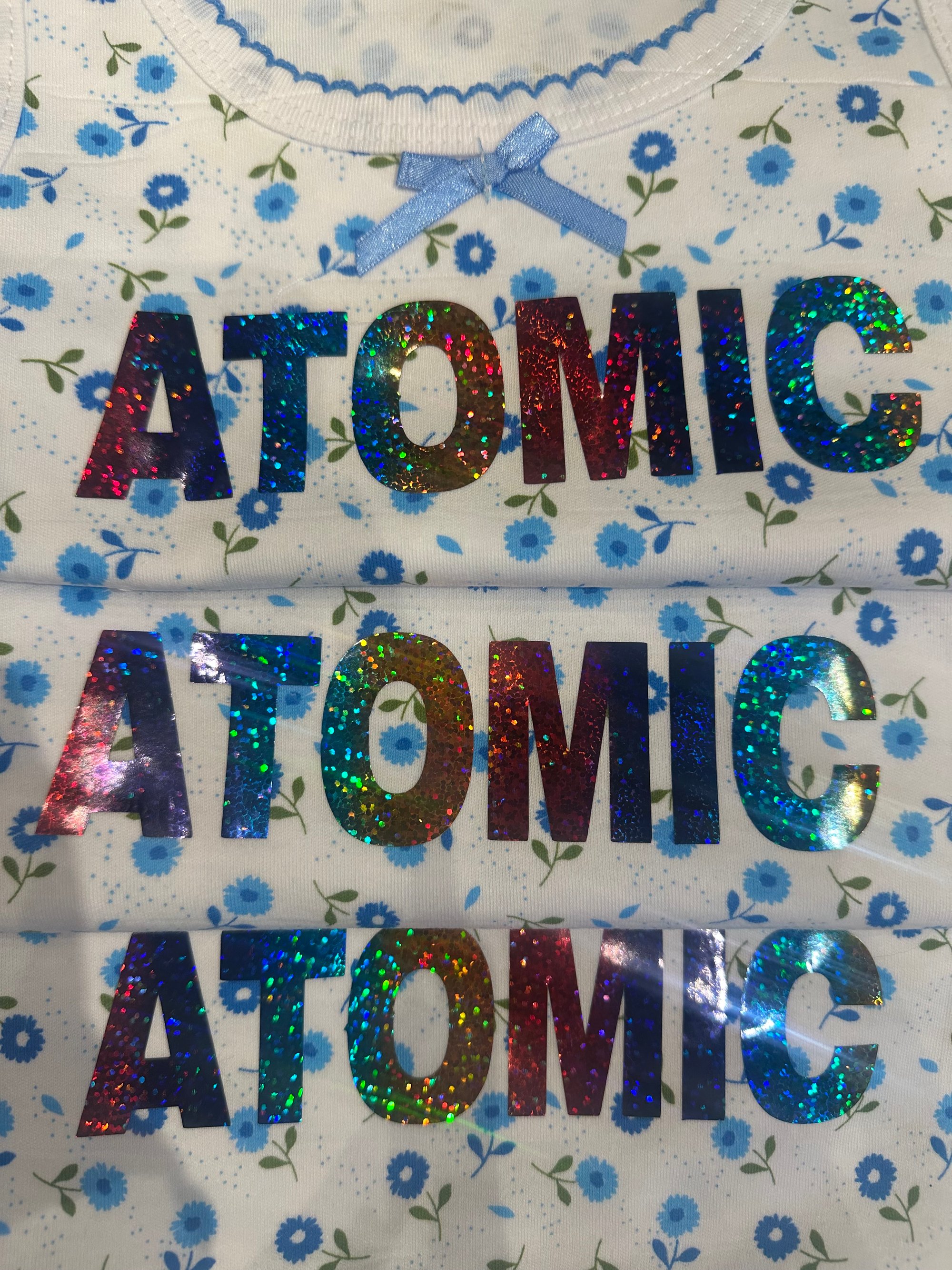 Deadstock 100 % cotton white and blue floral tank top with mini blue bow and tiny blue fine trim and ruffle hem - customised with Holographic Multicolour Rainbow Glitter “Atomic” print across front